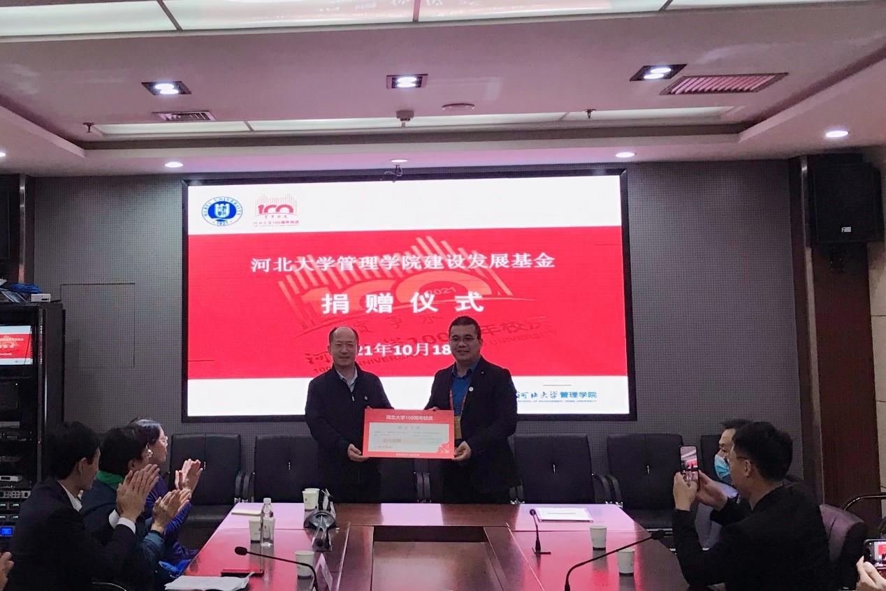 2021年10月18日,2003级电子商务专业校友、河北丽肤特拉集团董事长薛秀杰在百年校庆之际,为回馈母校培养,设立信息管理工程系“数智工作室创新创业专项基金”。基金金额10万元人民币,用于鼓励和支持信息管理工程系学子自主创业,为河北大学百年校庆添墨增彩。捐赠仪式在河北大学七一路校区best365网页版登录会议室举行,由best365网页版登录党委副书记马辉主持。学院领导班子成员及信息管理工程系师生代表参加仪式。