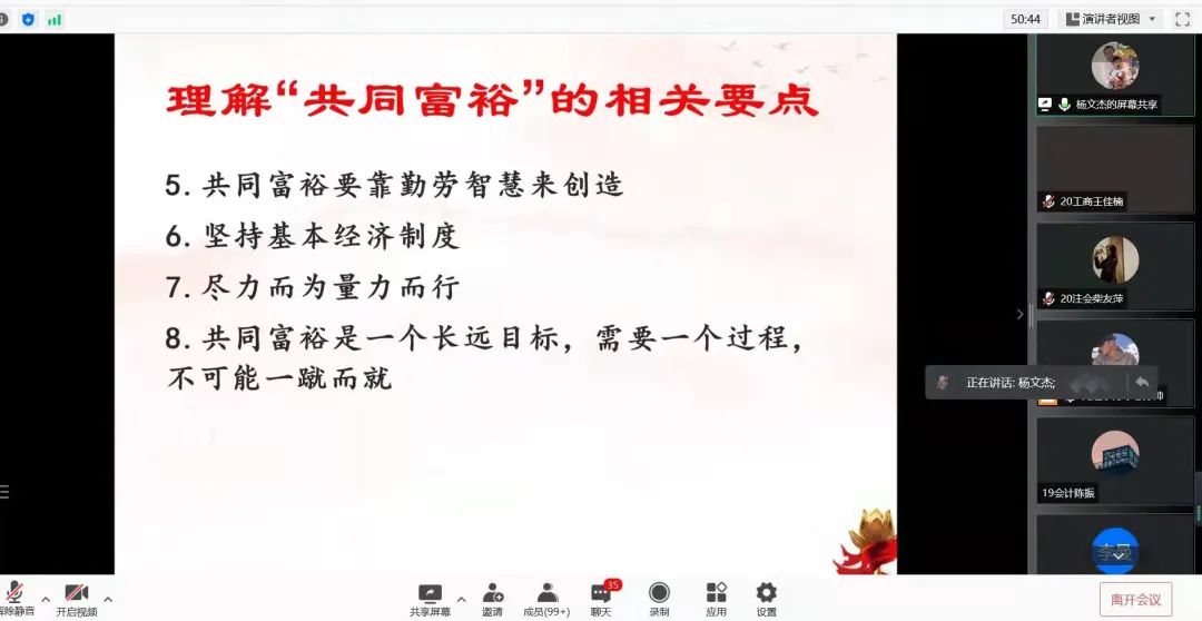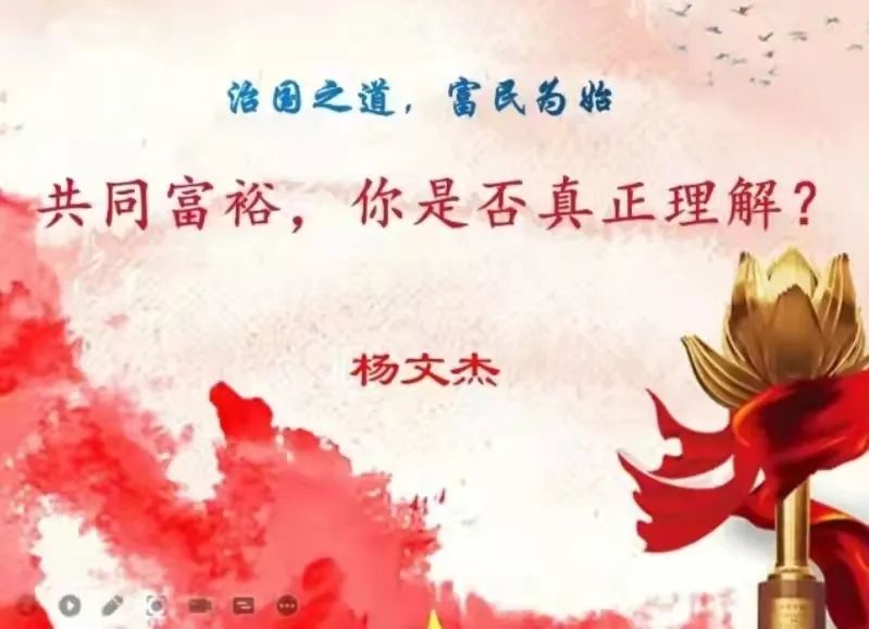 杨教授基于为什么要推进共同富裕,怎样推进共同富裕,以及如何巩固共同富裕这三个基本方面总结了十七个要点,使同学们对共同富裕的理解上升了一个层次,理解了何为真正的共同富裕。