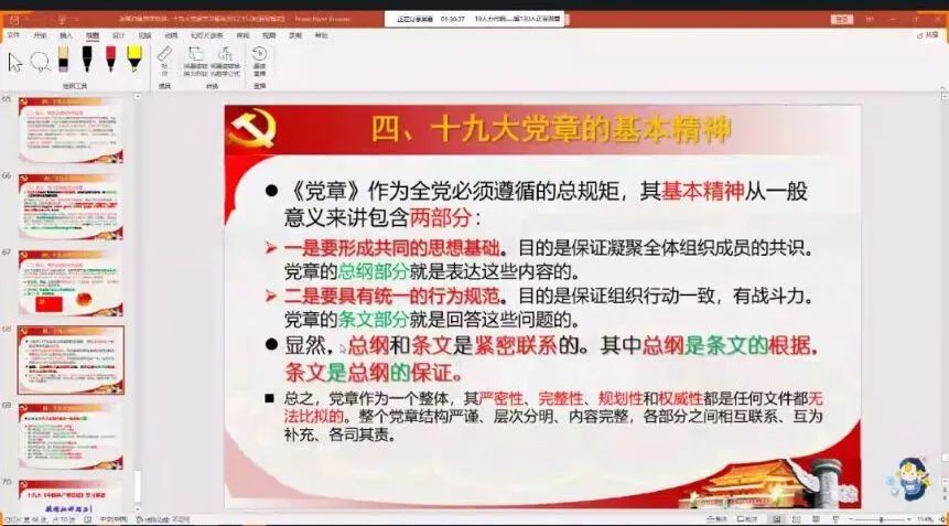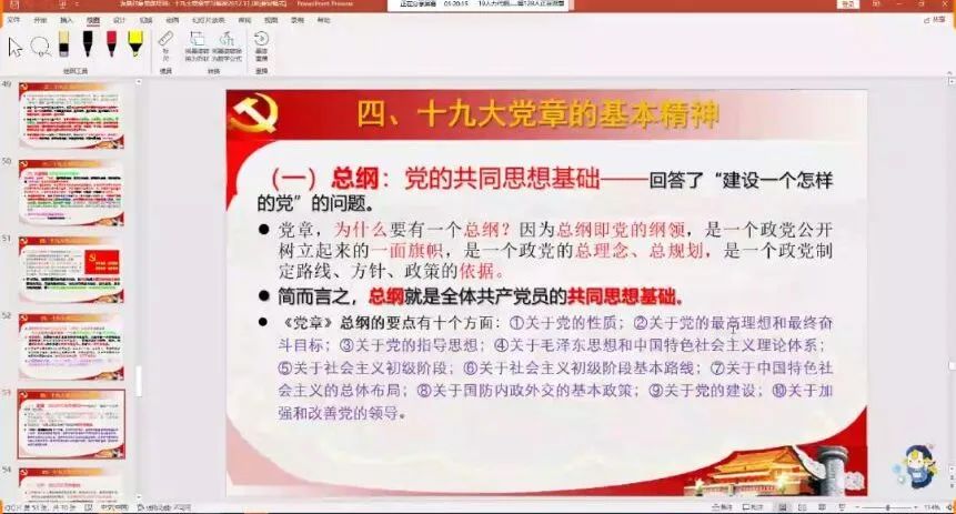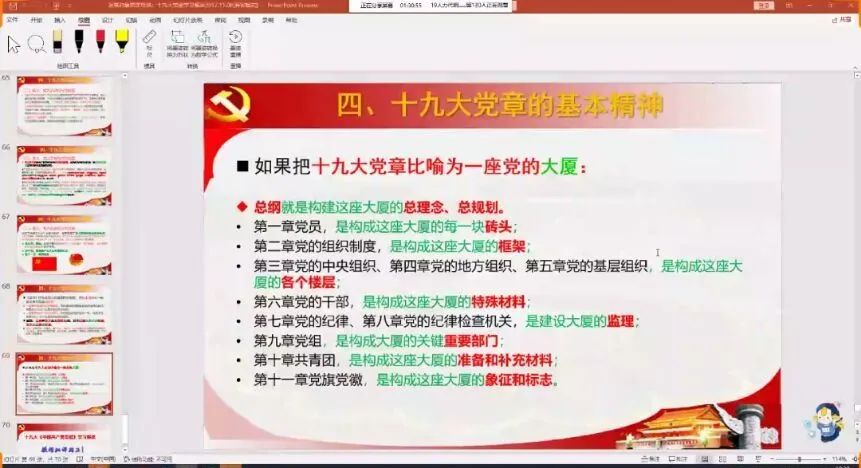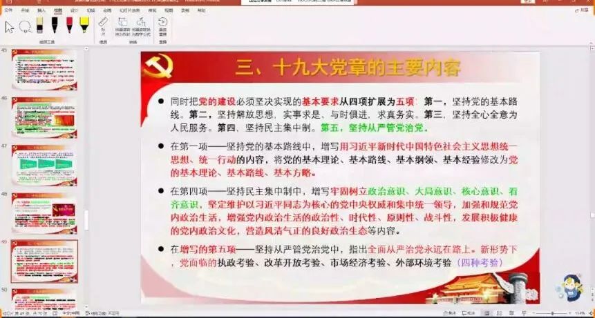 讲述了十九大党章的总纲和条文、党的性质、改革开放以来取得的一切成绩和进步的根本原因、习近平新时代中国特色社会主义思想的核心要义和主要内容、党的建设的总体要求。