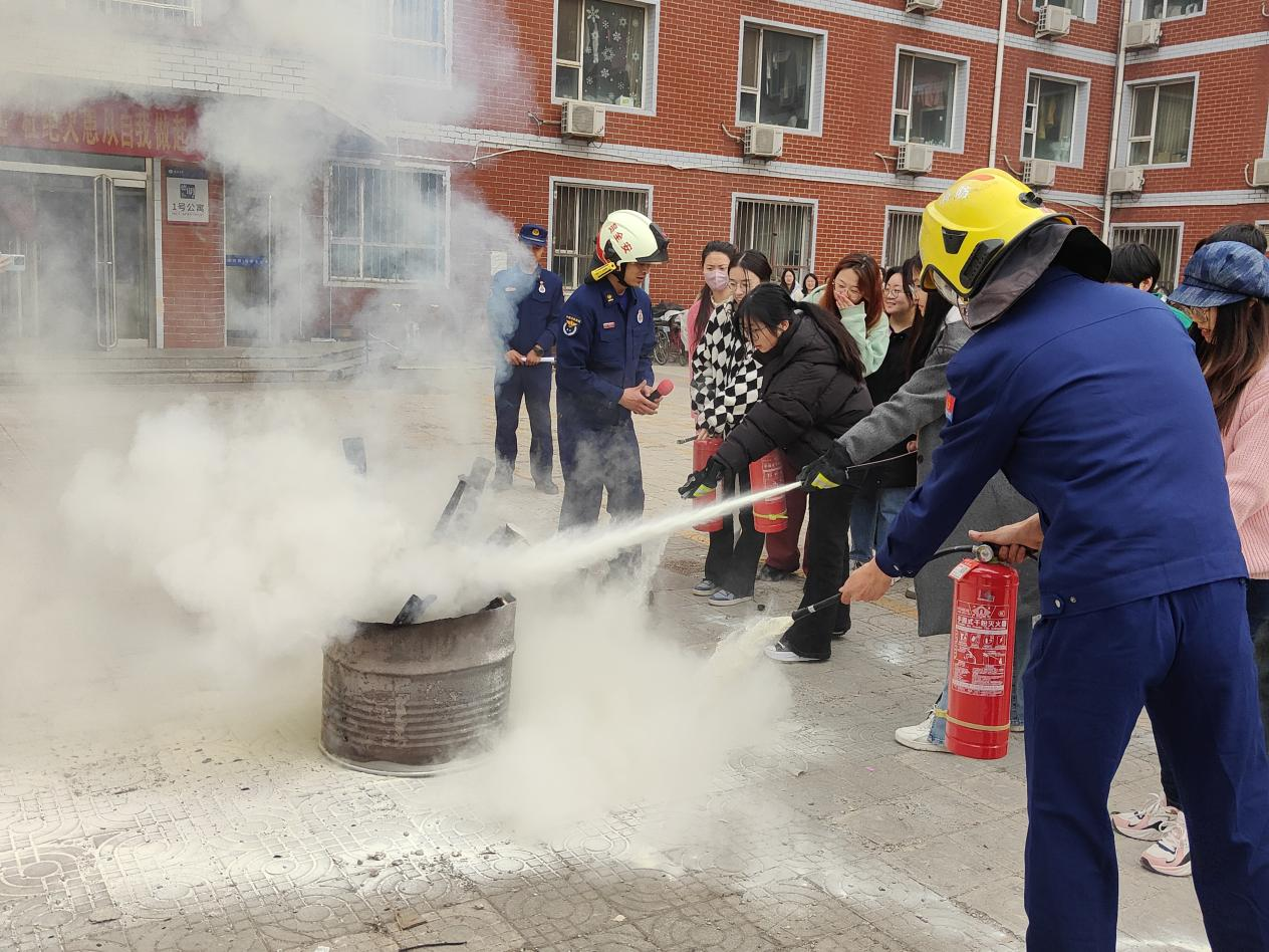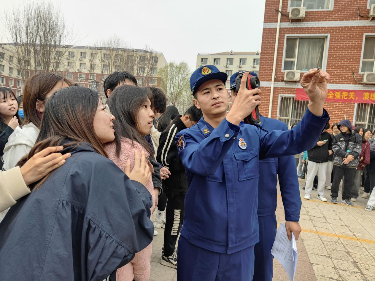 随后,消防队员向在场的学生和教师介绍了消防器材及干粉灭火器的使用方法,并现场进行了演示。在消防队员的指导下,部分学生还亲自体验了真实灭火器灭火,加深了对灭火器使用方法的理解与认识。学院师生通过本次演练,学习了灭火器的使用方法,丰富了大家的消防知识,传授了应急处置的安全方法。