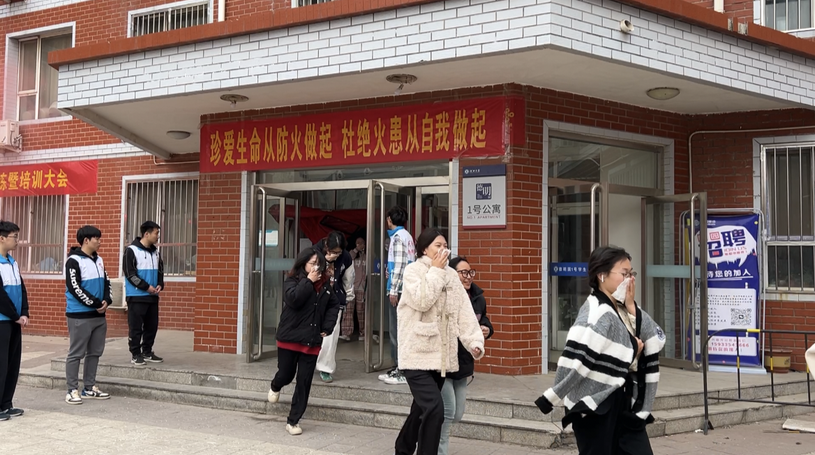 演练活动从德明1宿舍楼逃生疏散开始,火警信号响起、烟雾散出,在志愿者同学的引导下,200余名学生用湿毛巾蒙住口鼻、降低重心、俯身向下分别通过安全出口,整个过程中,学生们始终保持冷静并按照疏散预案有条不紊地撤离现场,整个演练过程急而不乱、稳定有序。
