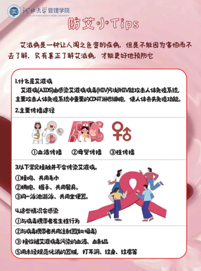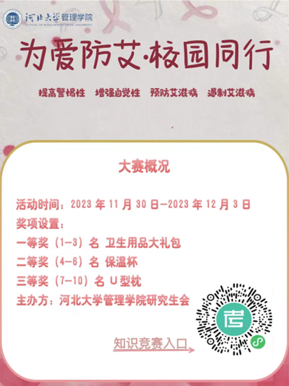 为提高人们对艾滋病的认识,广泛参与艾滋病防治工作,世界卫生组织于1988年1月将每年的12月1日定为“世界艾滋病日”。在第36个“世界艾滋病日”到来之际,best365网页版登录研究生会围绕“为爱防艾,校园同行”开展校园防艾活动,此次活动旨在提高学生对艾滋病的认知水平,加强预防艾滋病的意识。本次活动将于12月1日11:00在河北大学生活区景观大道举办,届时同学们可以前往领取预防艾滋病传播宣传页及红丝带,参与线上防艾知识竞赛,在答题小程序参与有关艾滋病的知识问答题,即有机会领取奖品,欢迎广大同学积极参与!